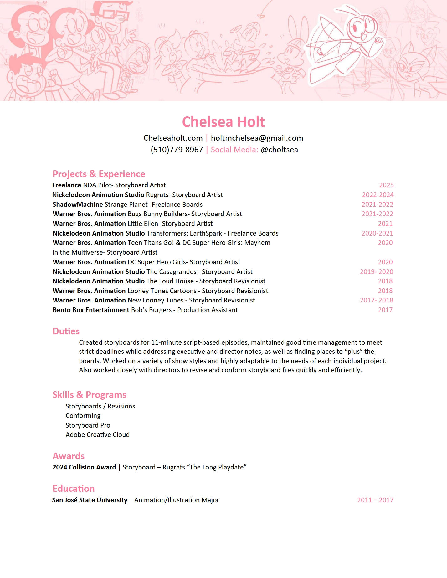 Hi, I'm Chelsea Holt! I'm a storyboard artist located in LA.I've been working in animation for over 8 years and have experience in comedy, action, adventure, drama, and musical boarding. My strengths are character acting, clear and dynamic staging, and a knack for adding fun visual gags. When I'm not boarding, I like to work on craft projects, go on hikes, and play tabletop games with friends. I also started learning 3D modeling and rigging for a video game passion project (The Gnome Game)!If you'd like to contact me with work inquiries, you can reach me at holtmchelsea@gmail.com or say my name three times in front of a bathroom mirror.Please email me for protected samples!